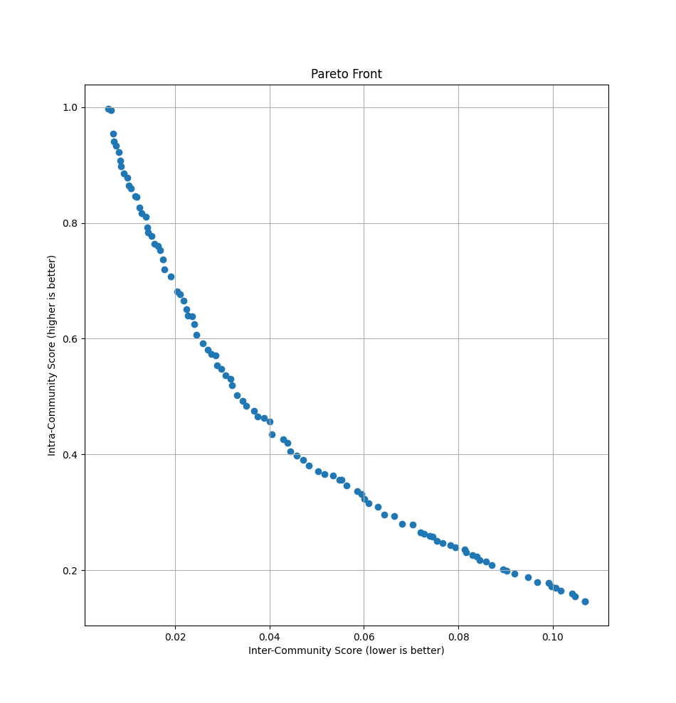To visualize the trade-offs between intra- and inter-community metrics across solutions, plot the Pareto front itself.